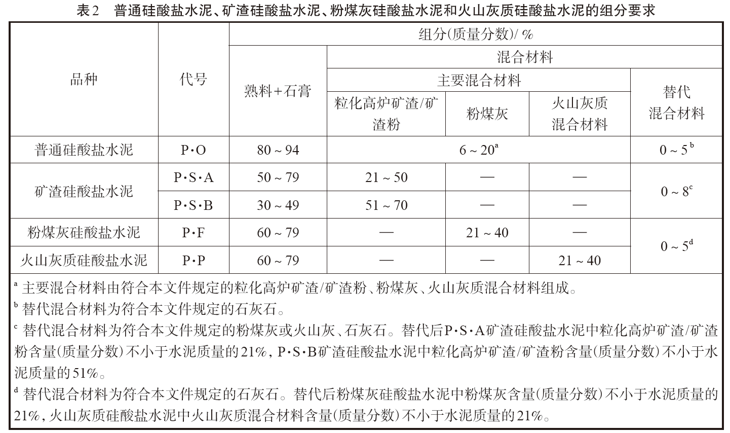 本次標準修訂,二者在組分上的最大變化是允許小于等于5%的石灰石替代主要混合材料。替代后粉煤灰硅酸鹽水泥中粉煤灰含量(質量分數(shù))不小于水泥質量的21%,火山灰質硅酸鹽水泥中火山灰質混合材料含量(質量分數(shù))不小于水泥質量的21%。具體見表2 中的備注d。